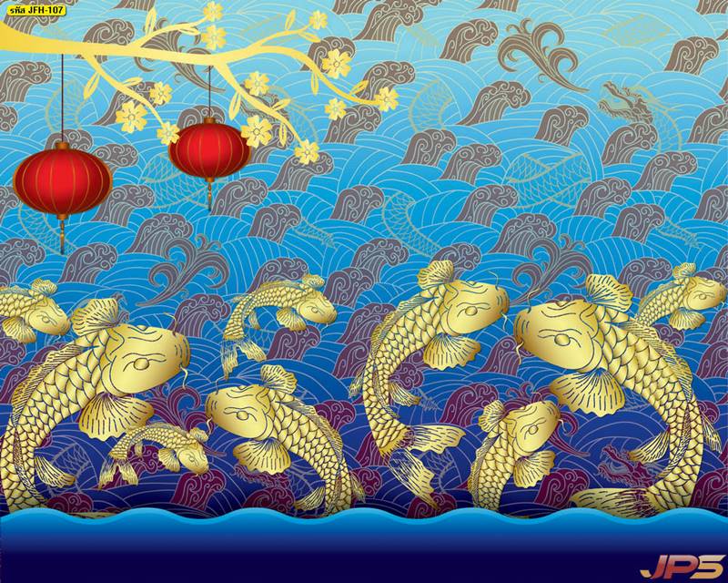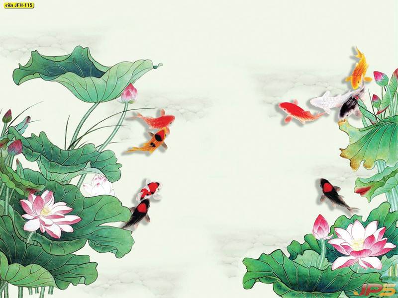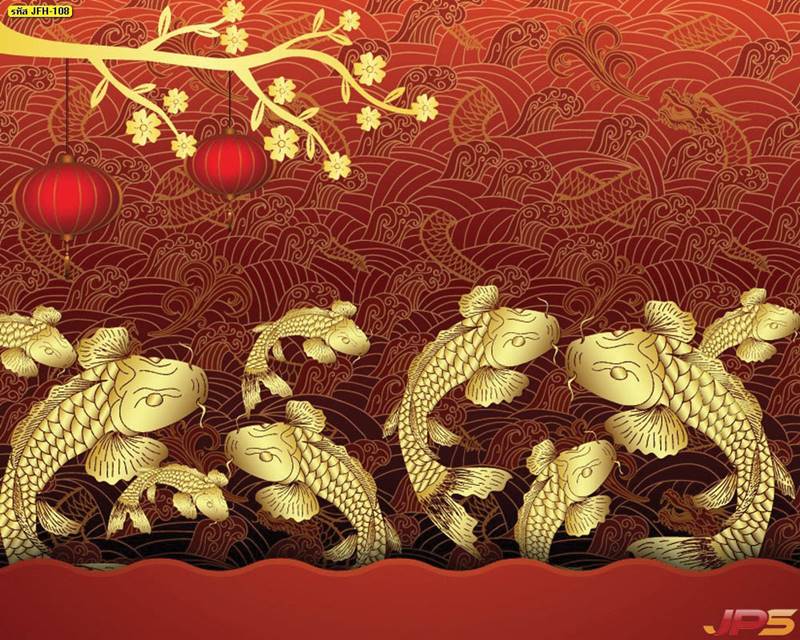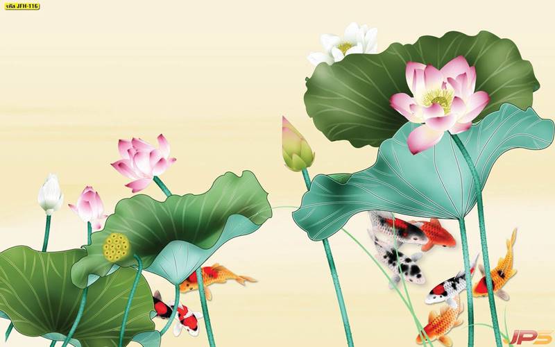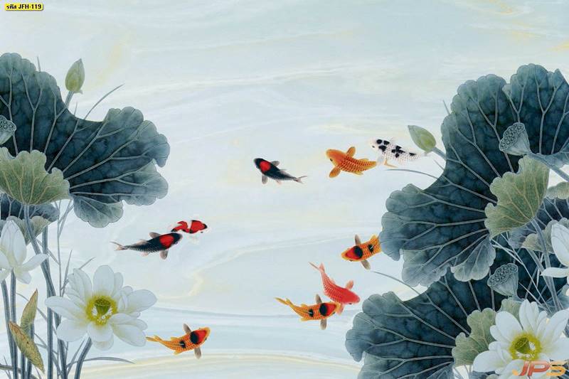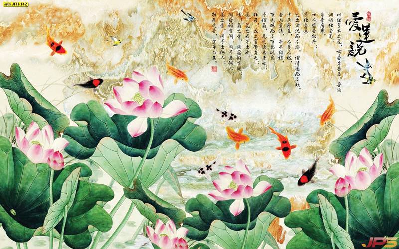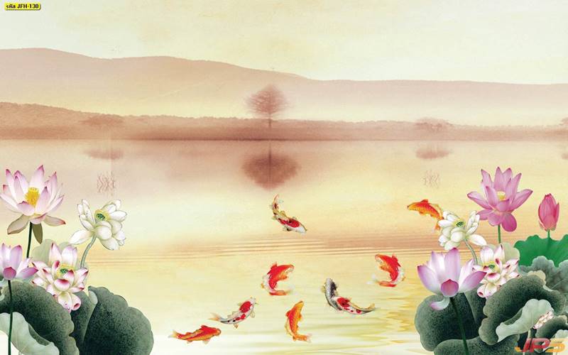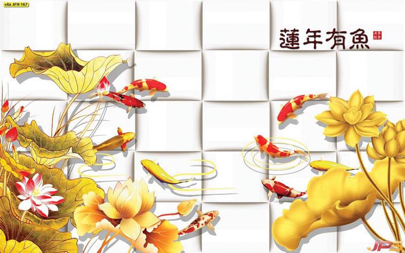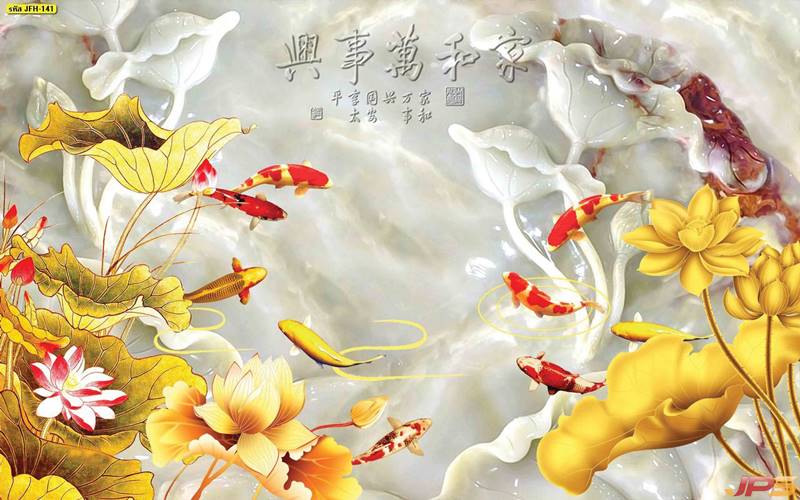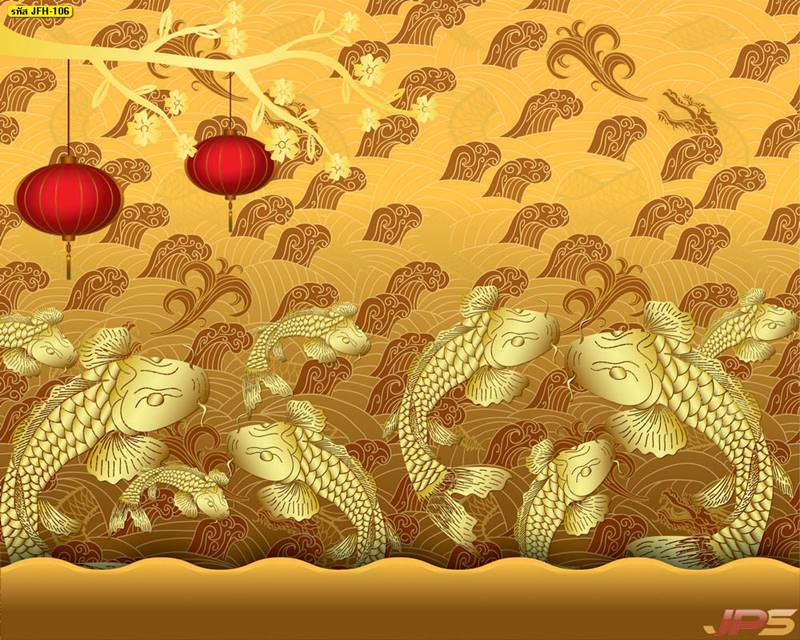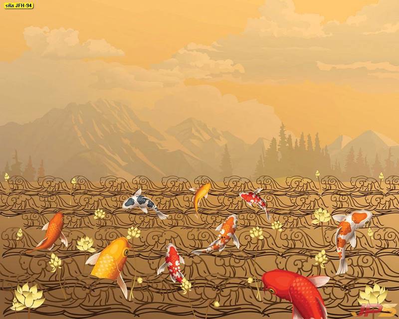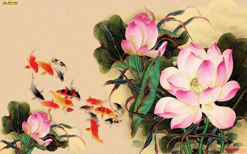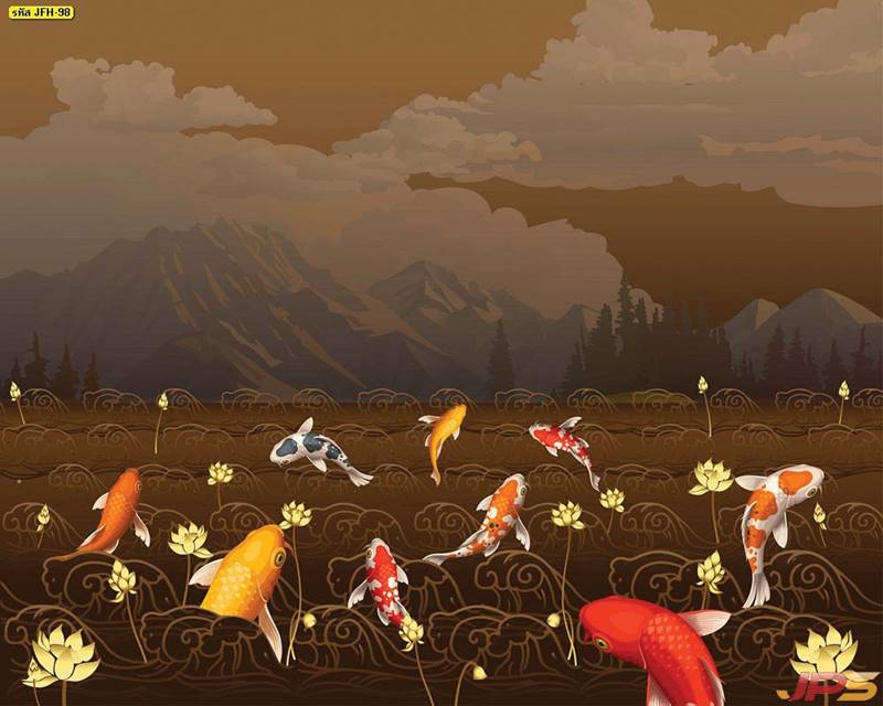 ลายปลาคราฟ ลายดอกบัว ปลา ลายสีทอง ลายฮวงจุ้ย ภาพพิมพ์ฮวงจุ้ย วอลเปเปอร์ฮวงจุ้ย สีทอง ปลาสีทอง ญี่ปุ่น ภาพวาดปลาคราฟ ภาพวาด