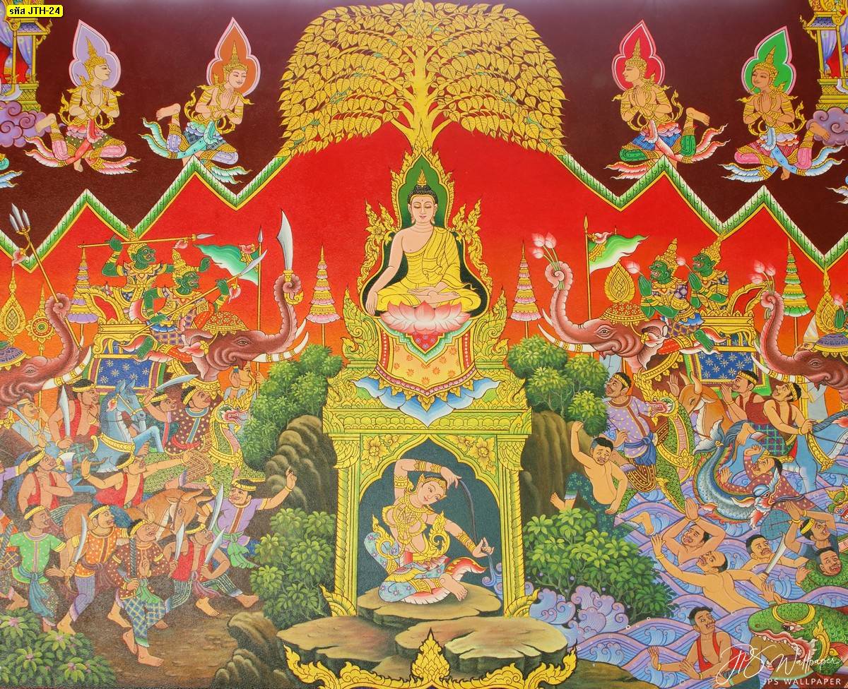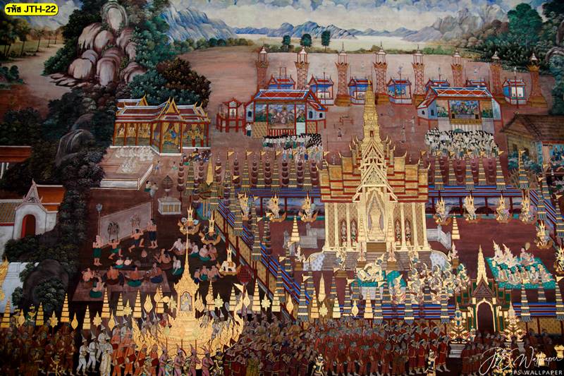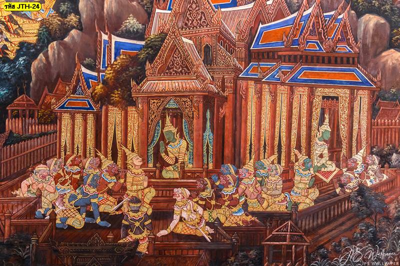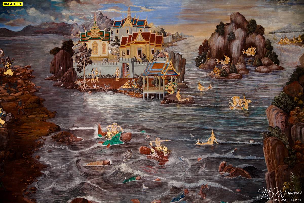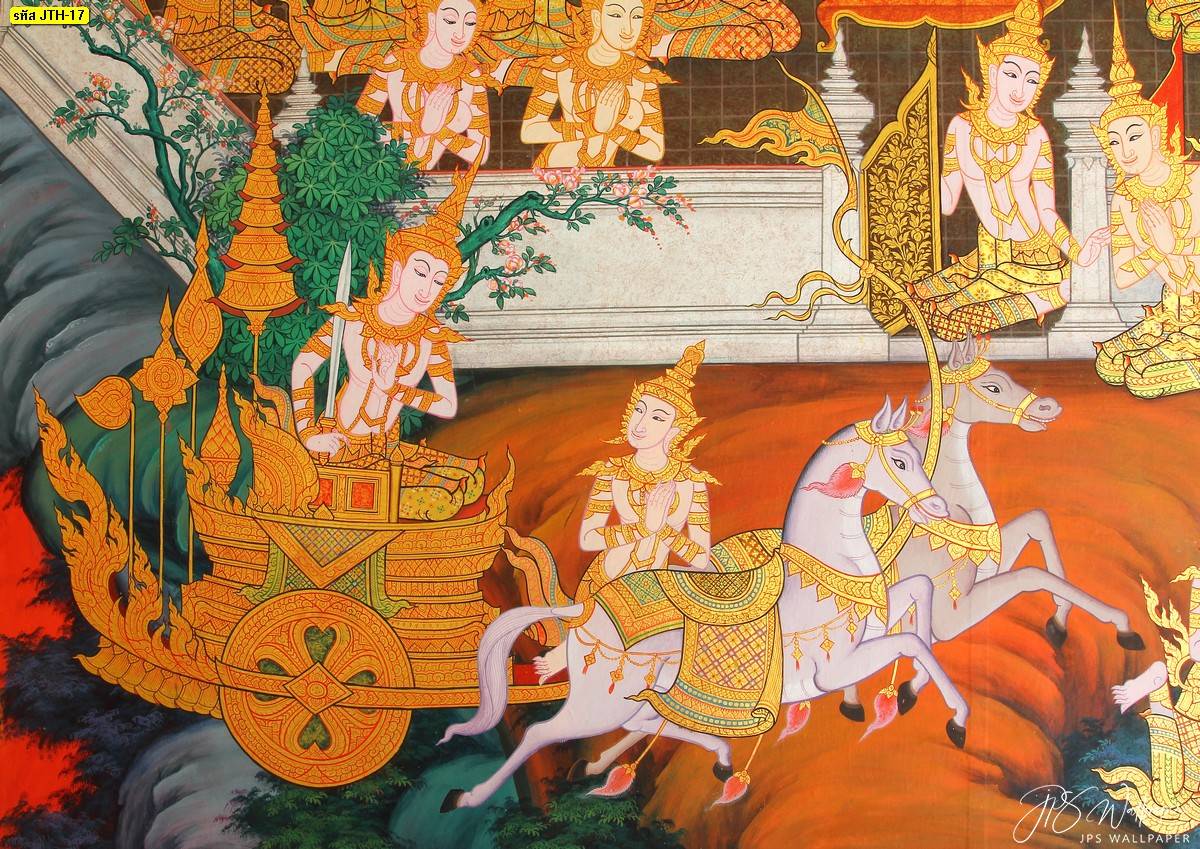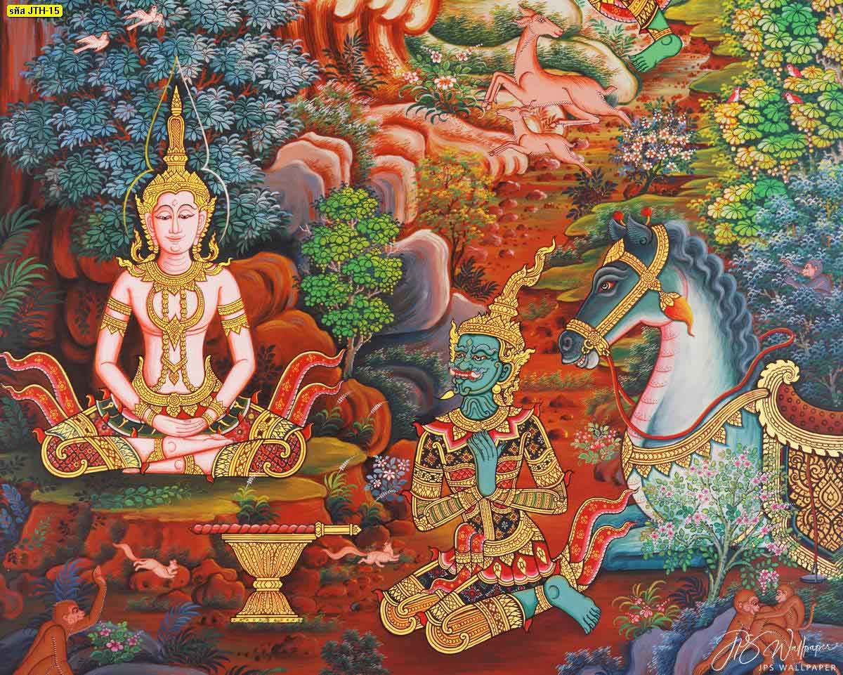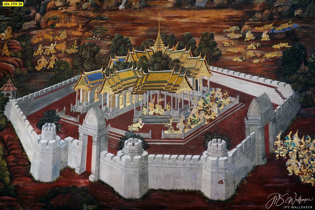 ลายจิตกรรมฝาผนัง จิตกรรมฝาผนัง ภาพวาด พุทธประวัติ ภาพพระ พระพุทธเจ้า รามเกียรติ์ พระราม หนุมาน ห้องพระ