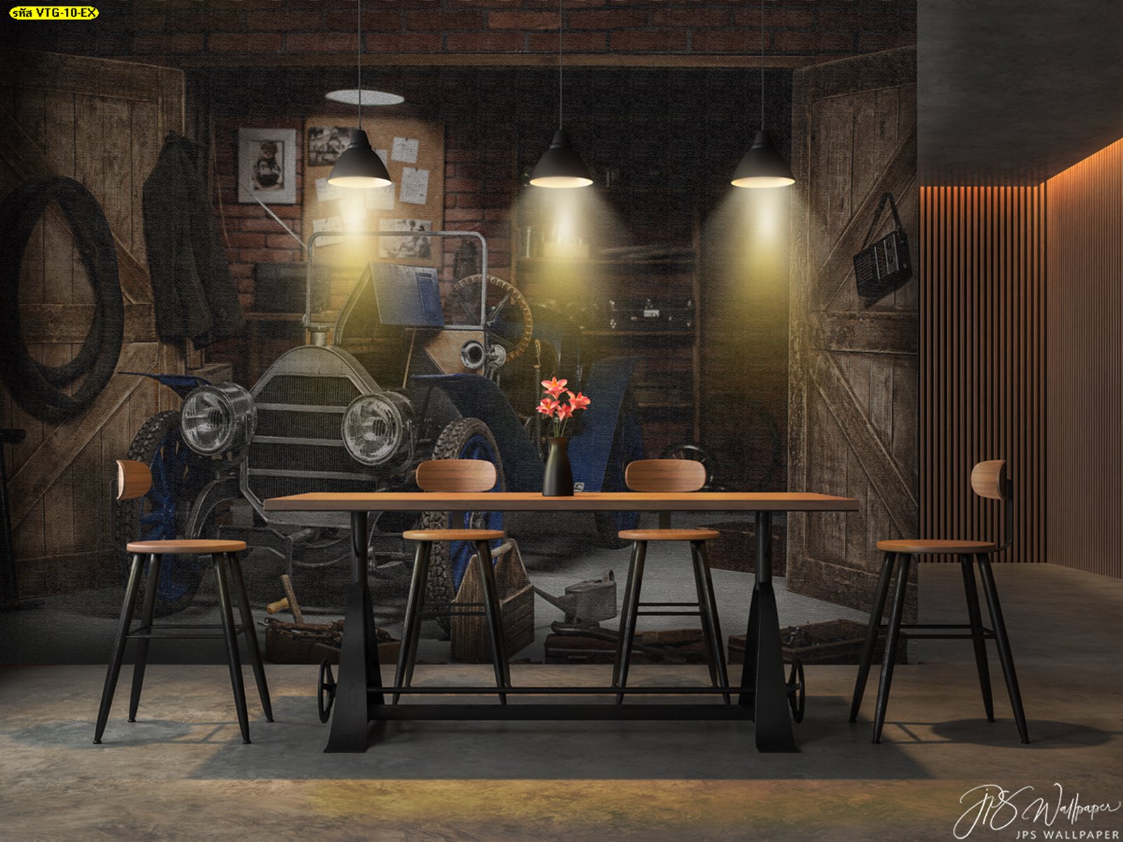 Loft style dining room with polished cocrete 3d render,Furnished with industrial style wood and metal furniture,Decorate wall with wood lattice.