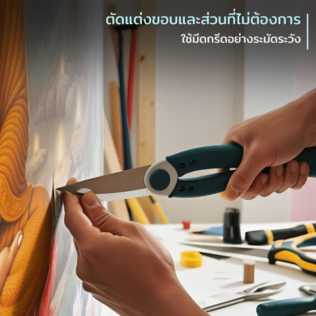 ตัดแต่งขอบ ใช้มีดคมตัดแต่งขอบวอลเปเปอร์ที่เกินออกมาอย่างระมัดระวัง