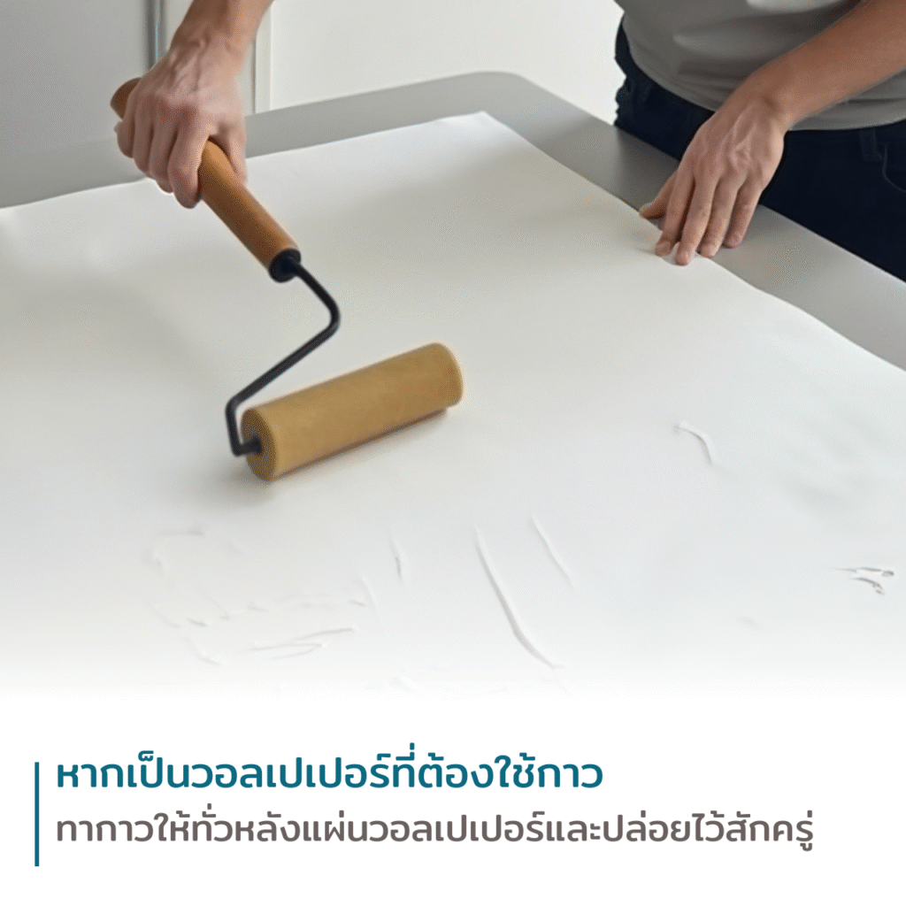 ทากาว หากเป็นวอลเปเปอร์ที่ต้องใช้กาว ให้ทากาวให้ทั่วหลังแผ่นวอลเปเปอร์และปล่อยไว้สักครู่ตามคำแนะนำของผู้ผลิต