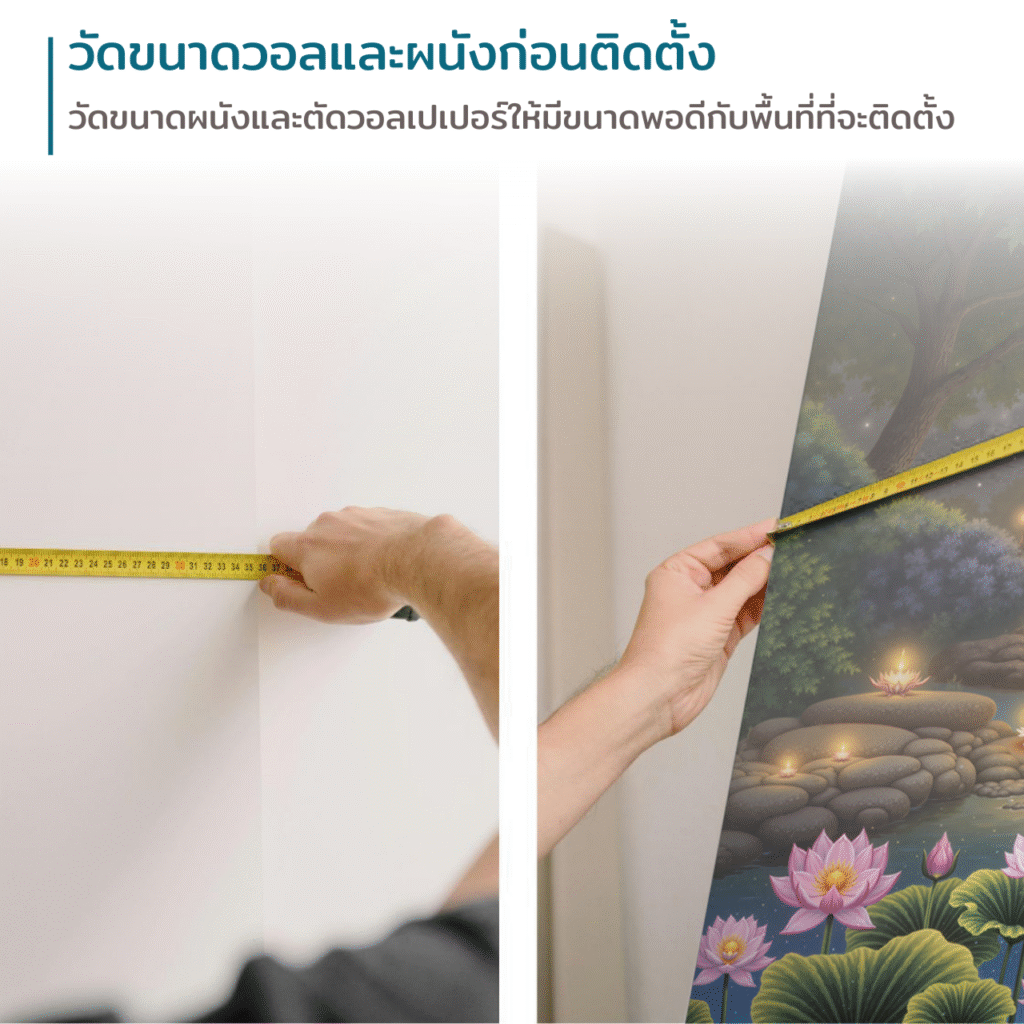 วัดและตัดวอลเปเปอร์ วัดขนาดผนังและตัดวอลเปเปอร์ให้มีขนาดพอดีกับพื้นที่ที่จะติดตั้ง โดยเพิ่มความยาวเล็กน้อยเพื่อการปรับแต่ง