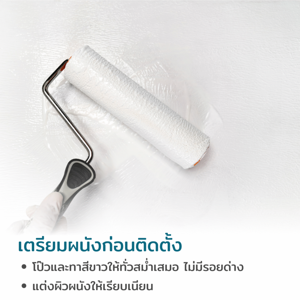 เตรียมพื้นผิว ทำความสะอาดผนังให้ปราศจากฝุ่นและคราบสกปรก หากผนังไม่เรียบหรือมีรอยแตก ควรปรับพื้นผิวให้เรียบเนียนเพื่อการติดตั้งที่ดีขึ้น