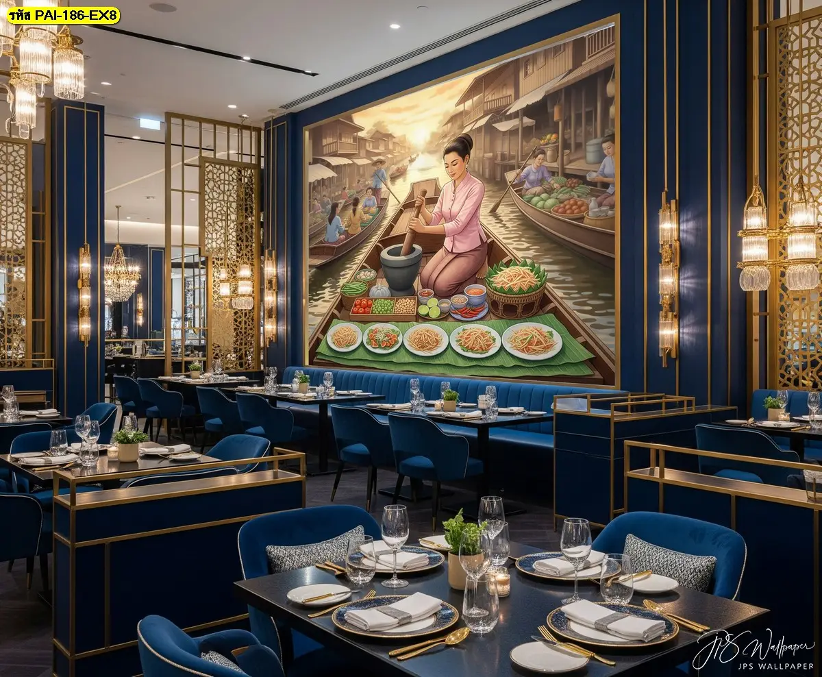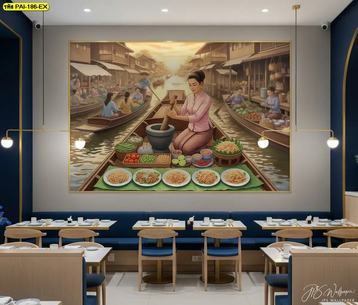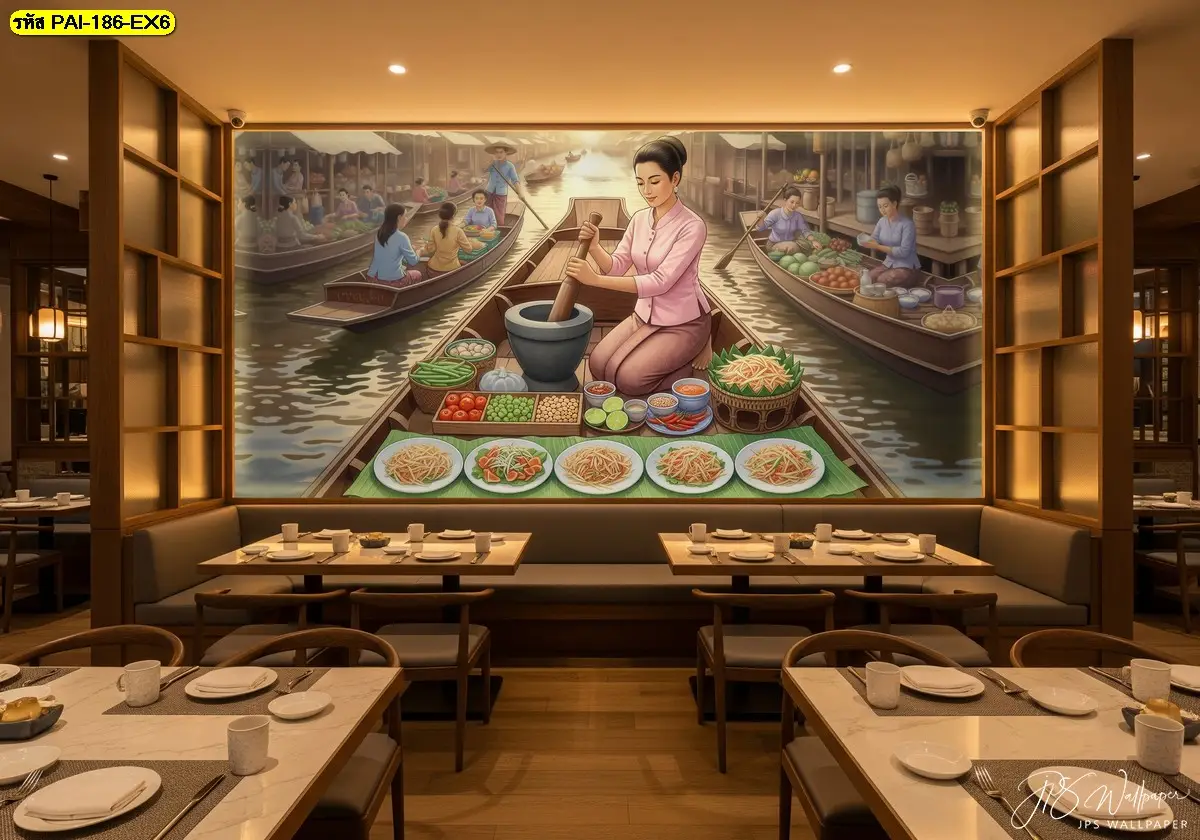 ภาพวาดที่สะท้อนวิถีชีวิตไทย เช่น ตลาดน้ำ การค้าขายในเรือ หรือการเตรียมอาหารแบบดั้งเดิม เป็นภาพที่สามารถสร้างความรู้สึกอบอุ่นและเป็นกันเองให้กับร้านได้อย่างดี ภาพลักษณะนี้ช่วยทำให้ลูกค้าเชื่อมโยงกับบรรยากาศแบบไทย ๆ และเพิ่มเสน่ห์ให้กับพื้นที่ภายในร้าน