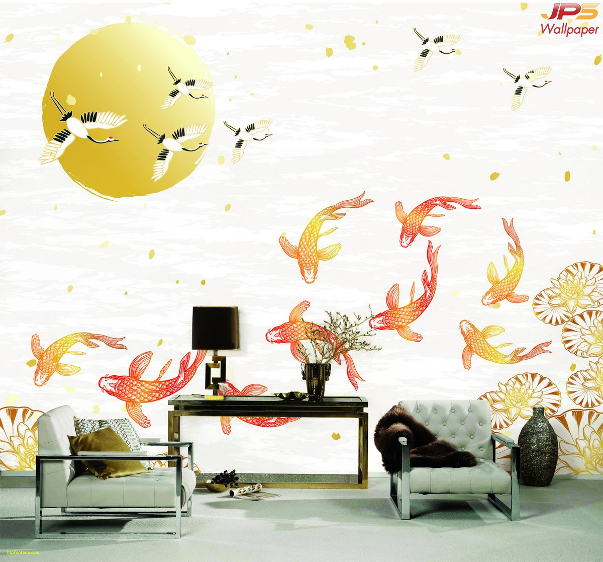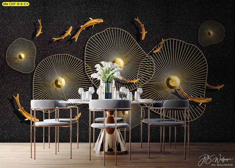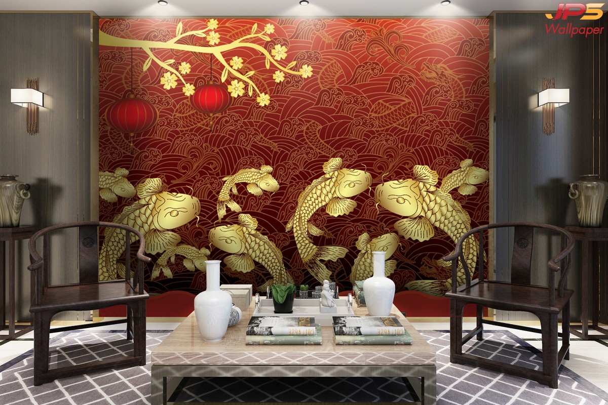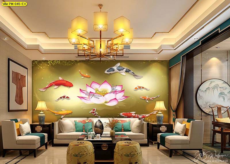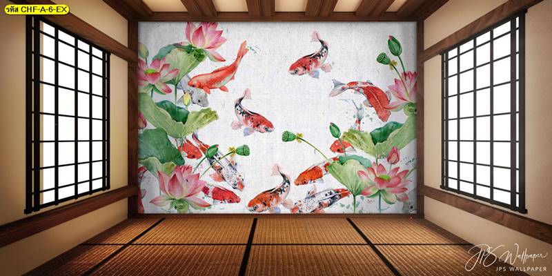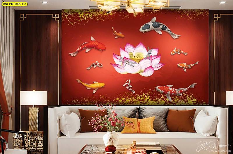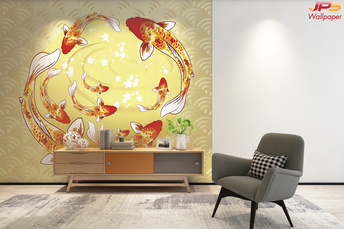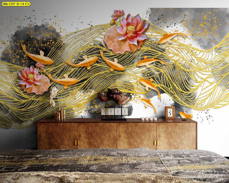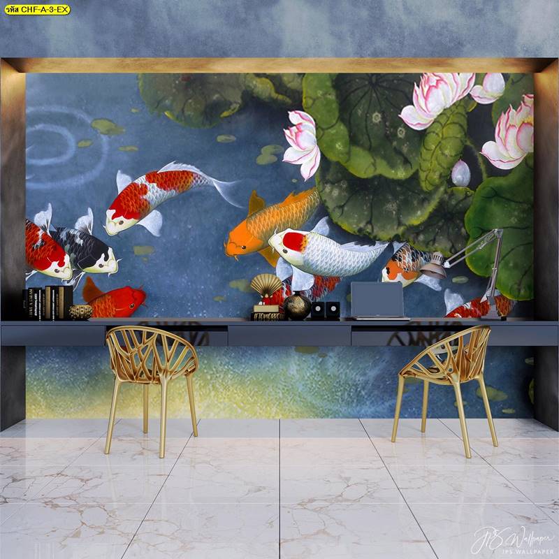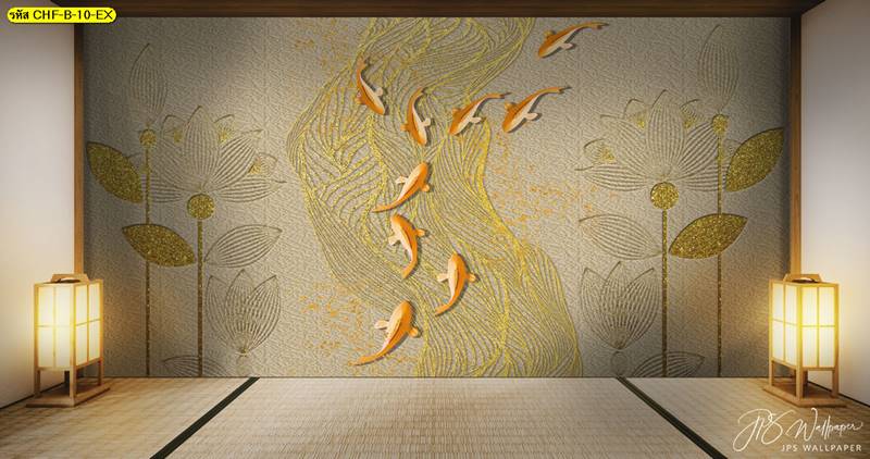 ลายปลาคราฟ ลายดอกบัว ภาพพิมพ์ปลาคราฟ วอลเปเปอร์ปลาคราฟ ลายสีทอง ลายฮวงจุ้ย ภาพพิมพ์ฮวงจุ้ย วอลเปเปอร์ฮวงจุ้ย