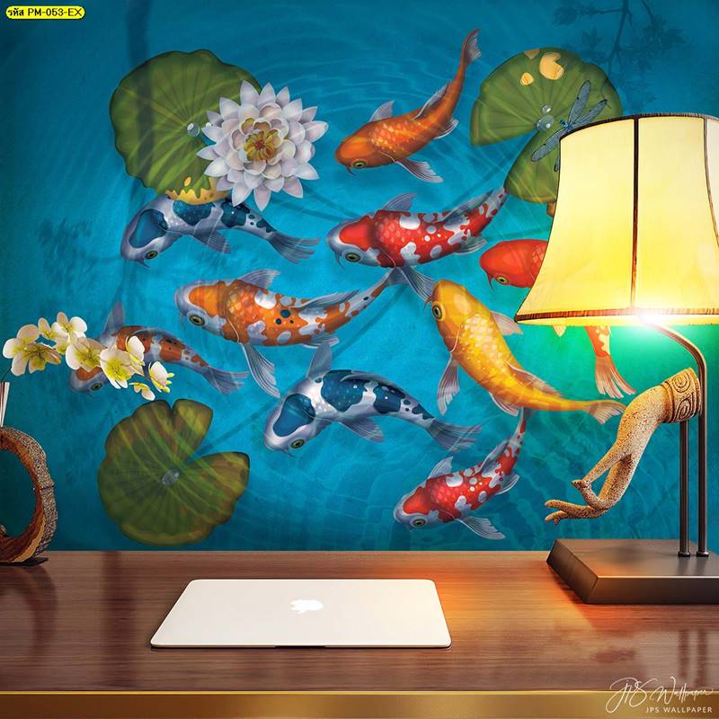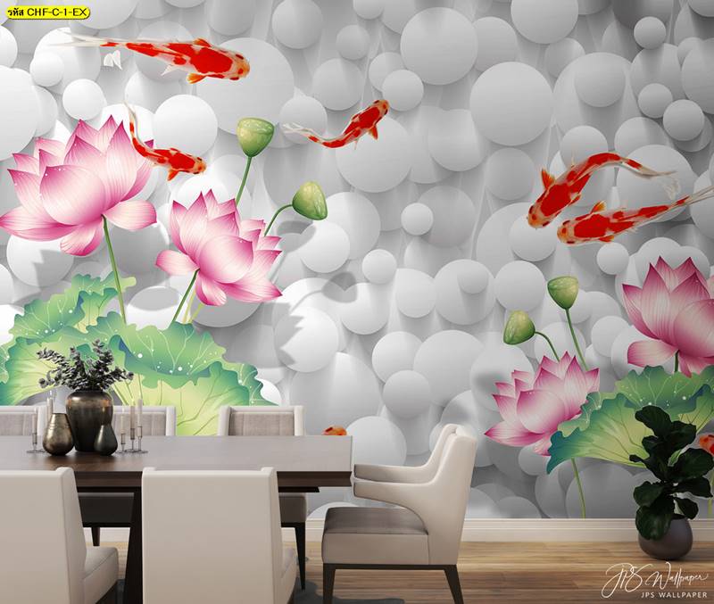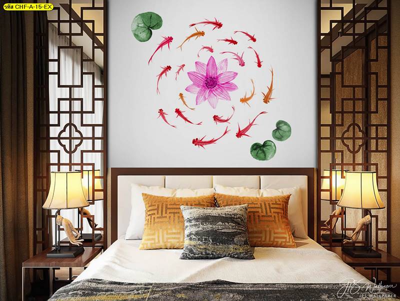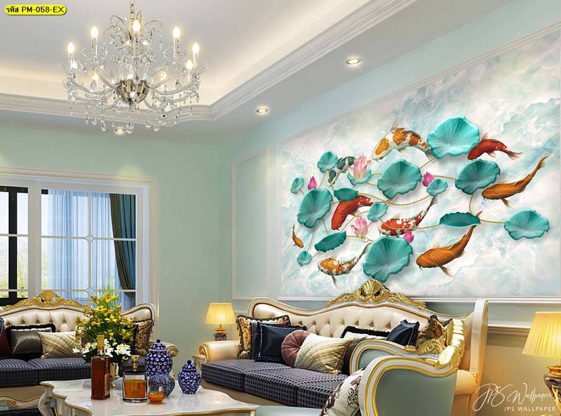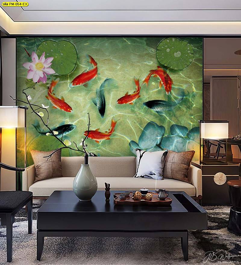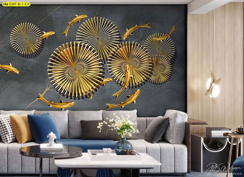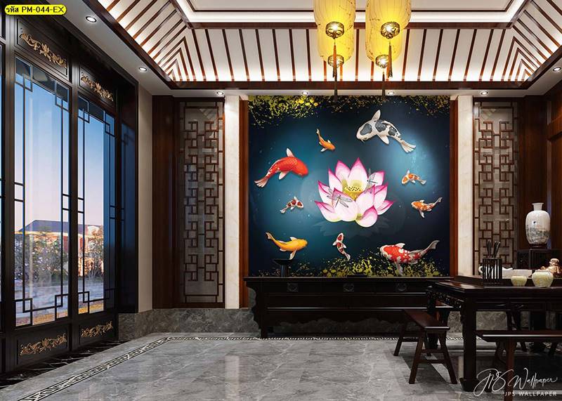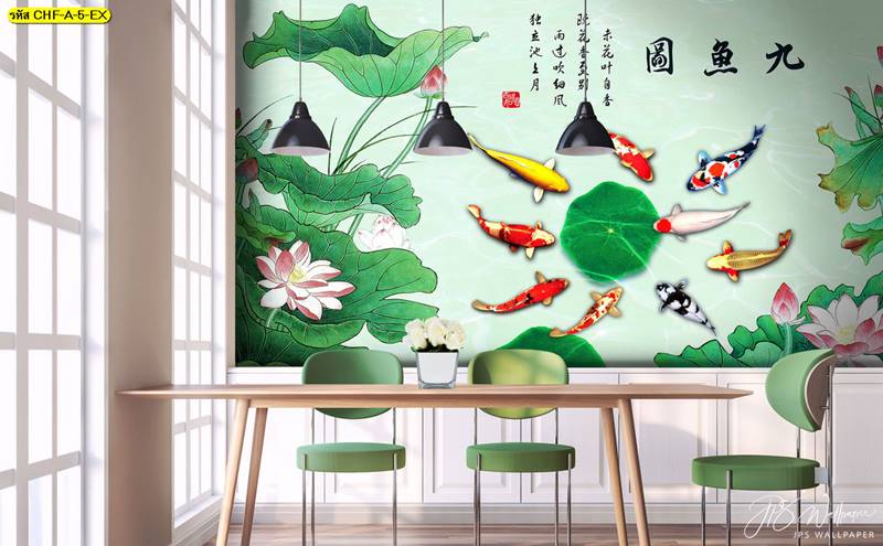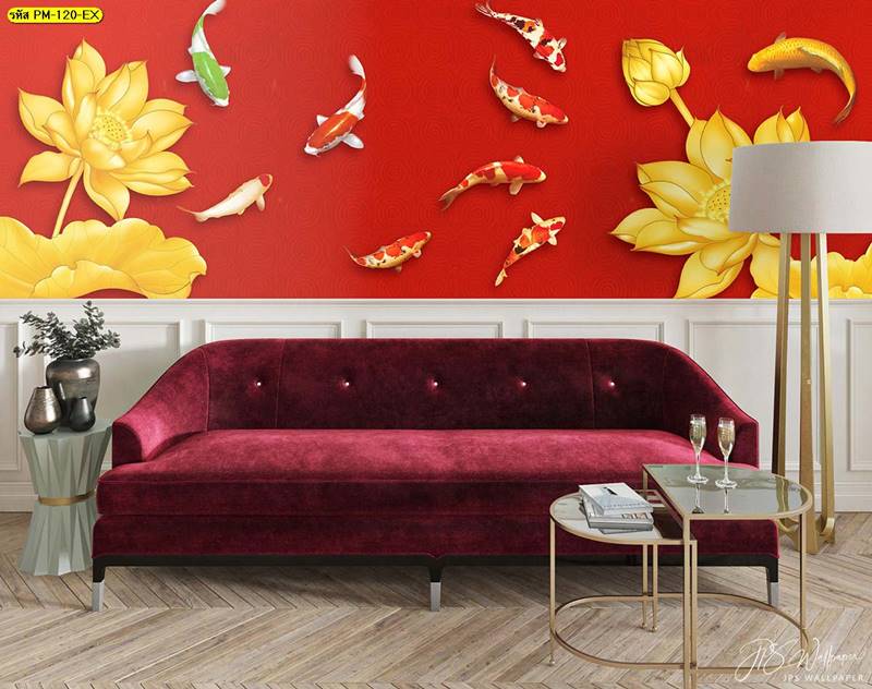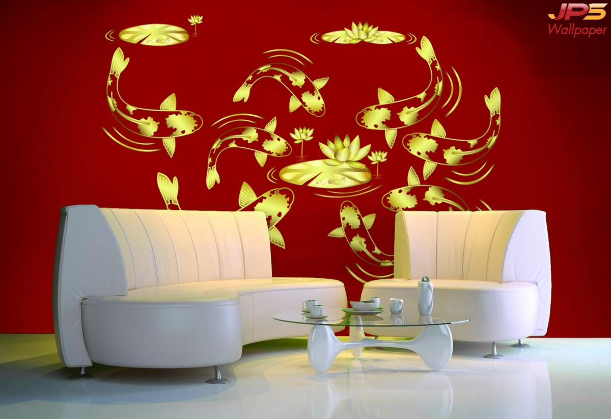 ลายปลาคราฟ ลายดอกบัว ภาพพิมพ์ปลาคราฟ วอลเปเปอร์ปลาคราฟ ลายสีทอง ลายฮวงจุ้ย ภาพพิมพ์ฮวงจุ้ย วอลเปเปอร์ฮวงจุ้ย