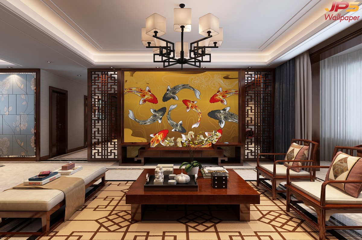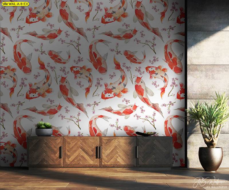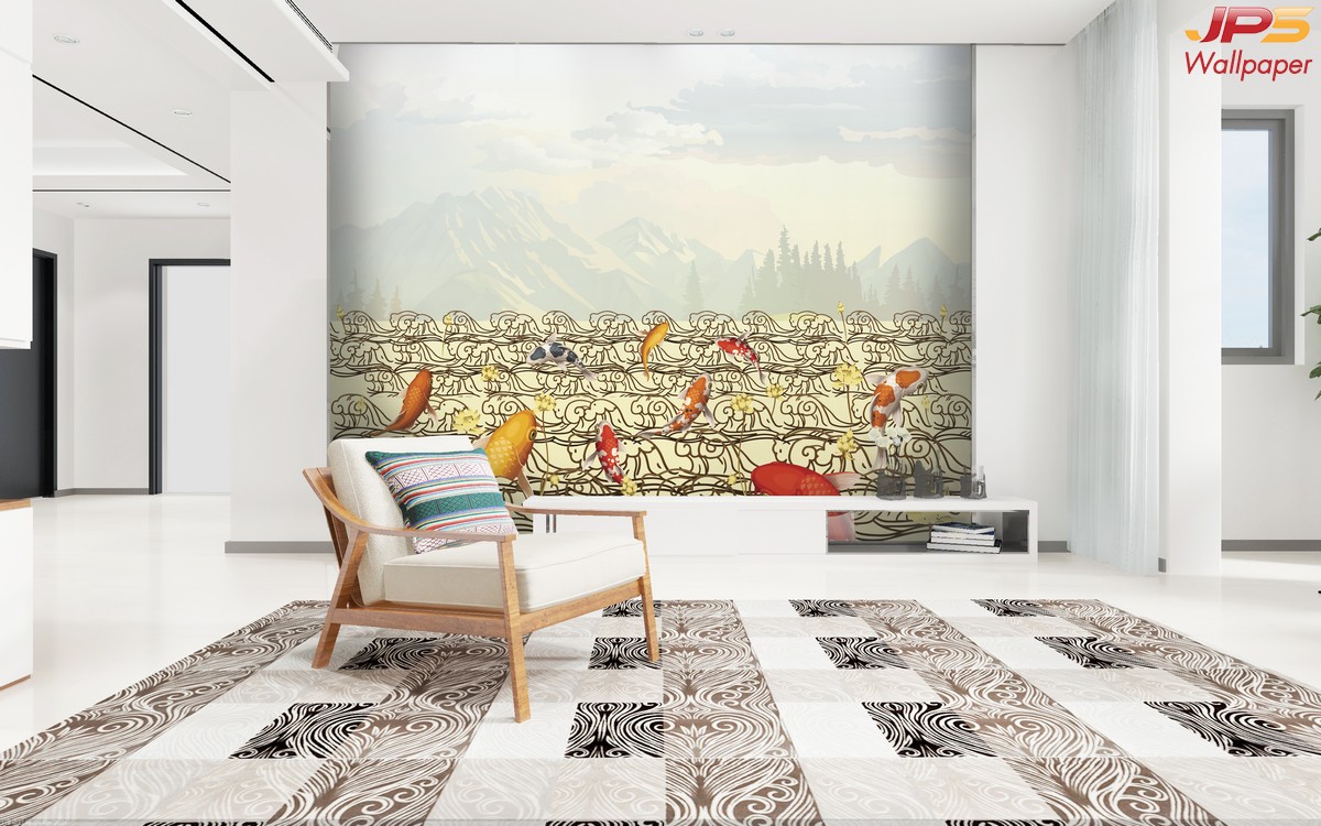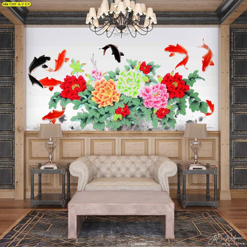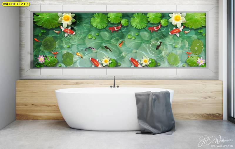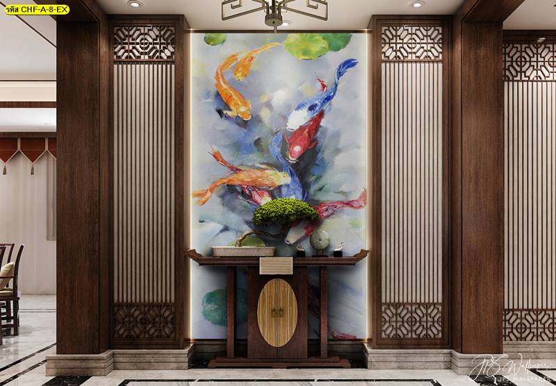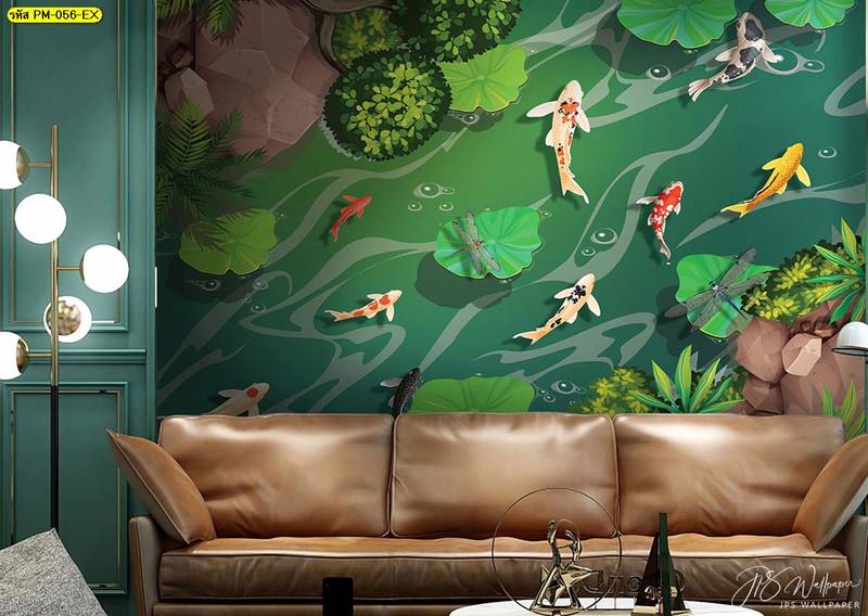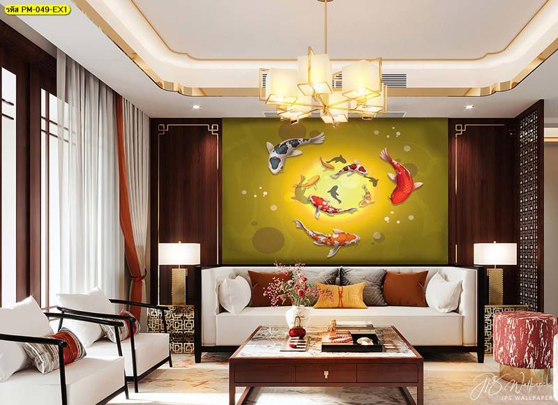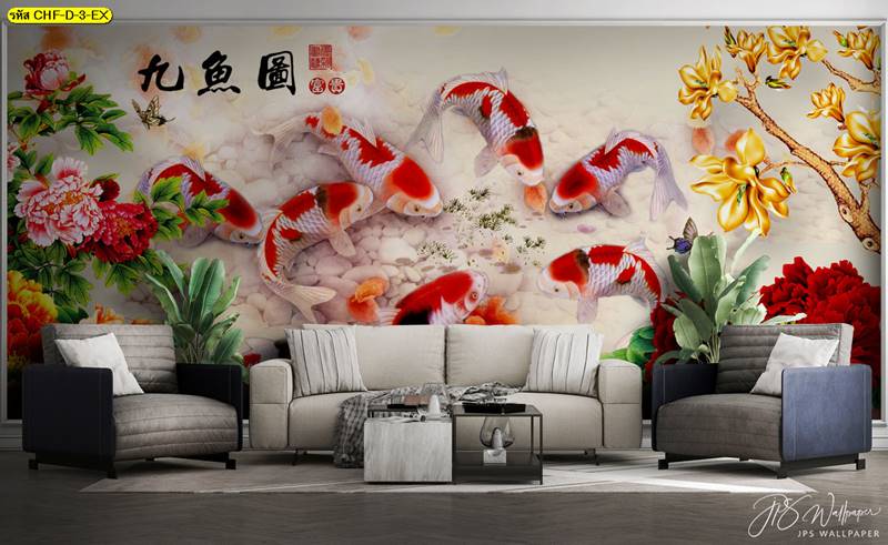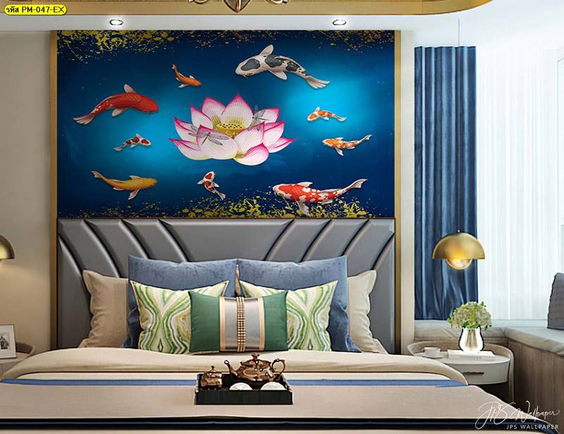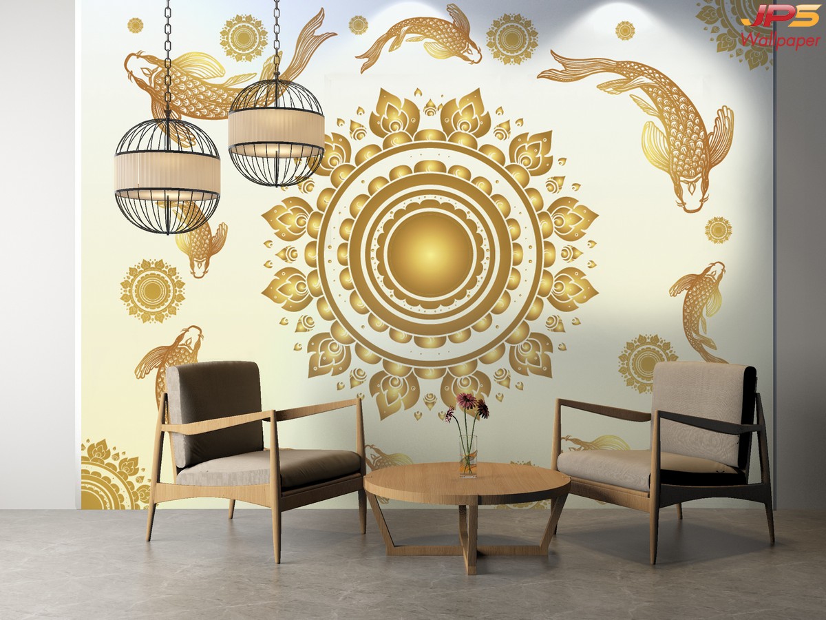 ลายปลาคราฟ ลายดอกบัว ภาพพิมพ์ปลาคราฟ วอลเปเปอร์ปลาคราฟ ลายสีทอง ลายฮวงจุ้ย ภาพพิมพ์ฮวงจุ้ย วอลเปเปอร์ฮวงจุ้ย