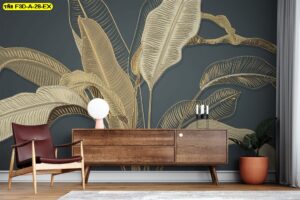 Classic interior with dresser, armchair, floor lamp, brown wood chevron floor and blank wall. 3d render illustration mockup.